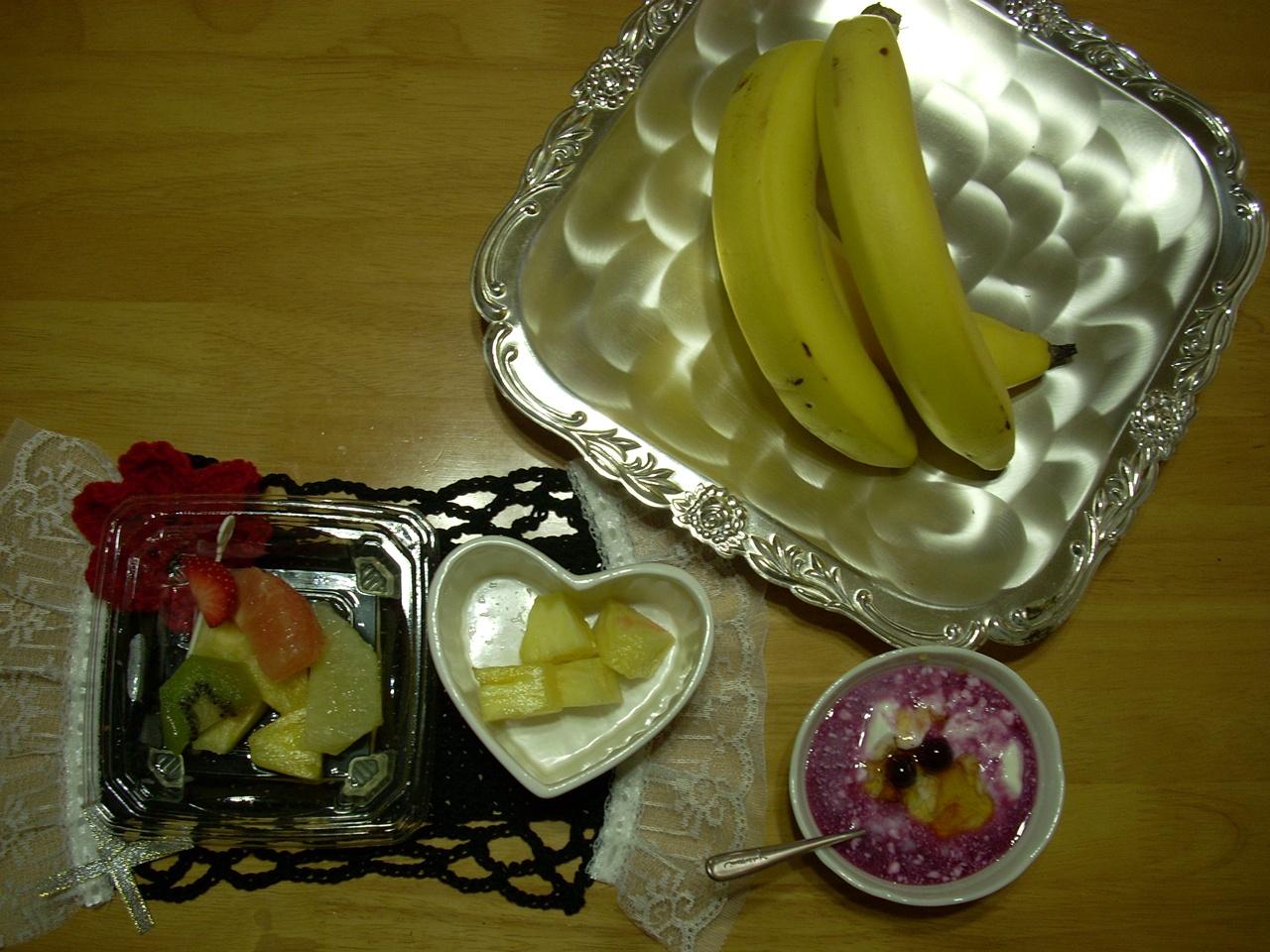 自然の産物に感謝です。バナナ、パイナップル、のイエロー、ベルーべりーのパープル、イチゴの赤、キュウイのグリーン果物大好き、綺麗な色です。❤  今日の朝食です。 抗酸化作用もバッチリ★ですよ。